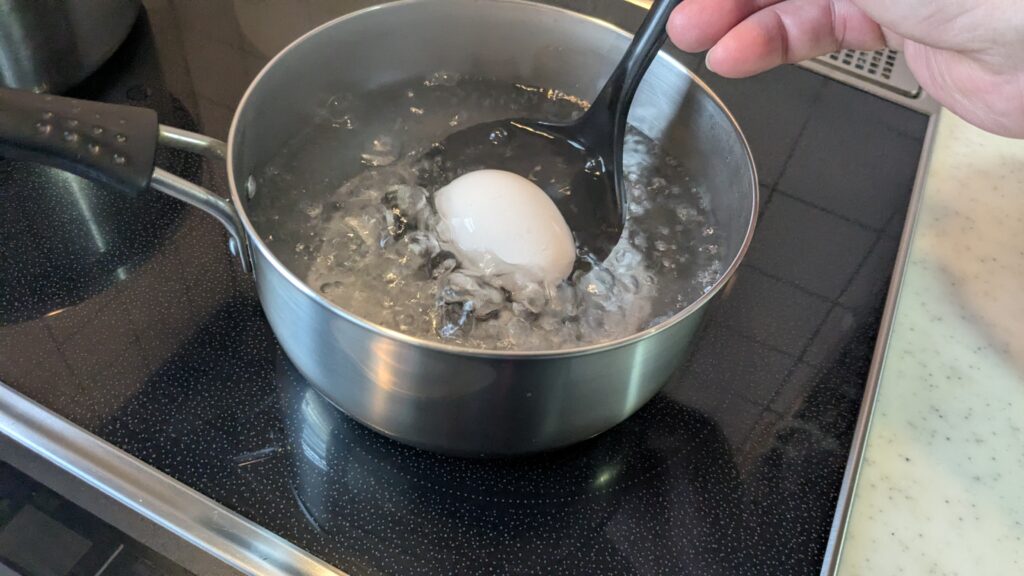 我が家は半熟好きなので、フライパンか鍋に1センチだけ水を入れて沸騰したら、卵を投入して6分茹でて、火を消して10分。それから自然に冷めるのを待つか、水で冷やして、殻を剥く。って感じです。
