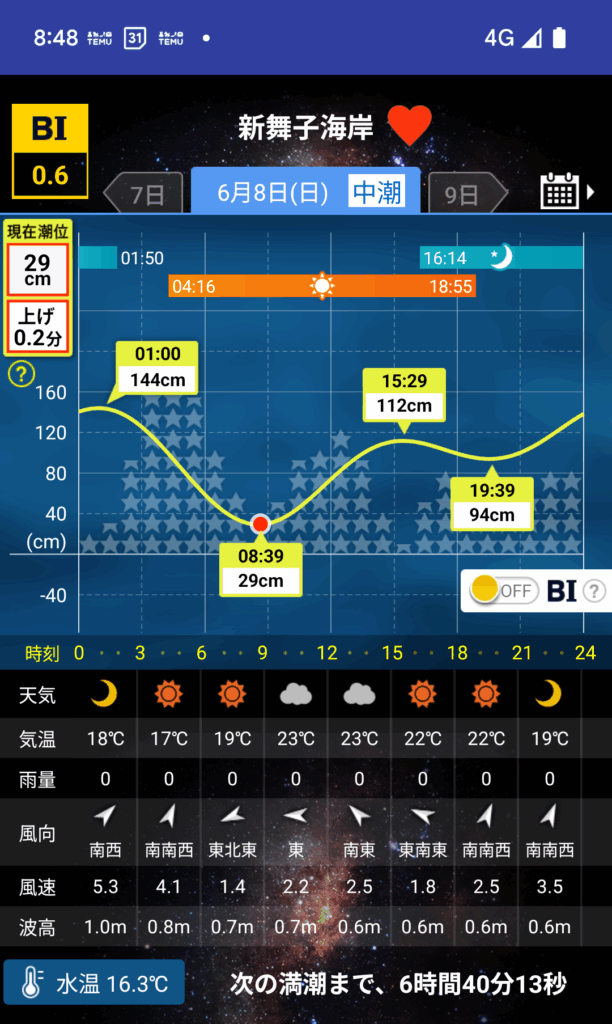 8:48、新舞子サーフへ移動!干潮8:39を華麗にスルー