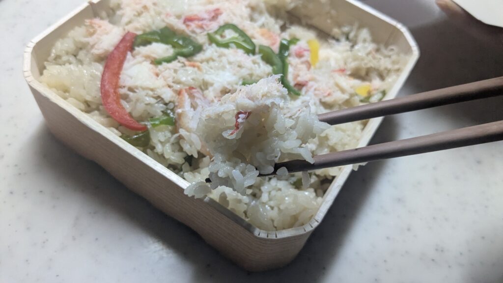 このむき身カニピラフは、手間なしで贅沢感を味わえるぞ。