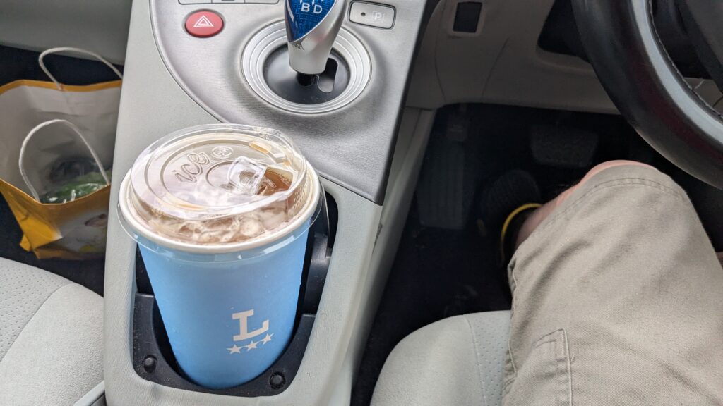 車内のエアコンと、たっぷり500mlのアイスコーヒーでドライブは快適そのもの。