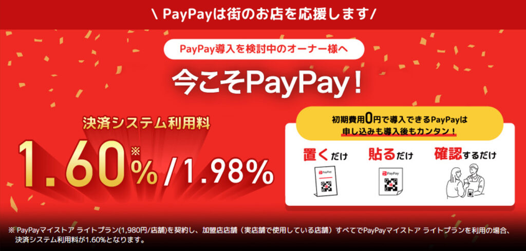 | PayPay | 無料 | 無料 | 約1.6%〜 | とにかく今どき!若者&スマホ世代に強い |