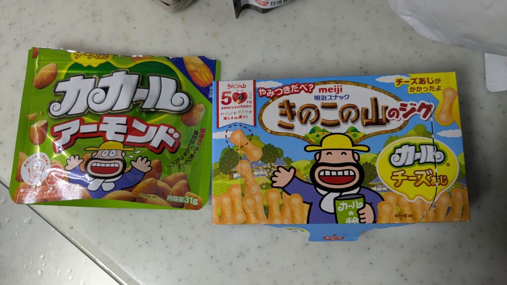 「きのこの山のジク」も「カカールアーモンド」も、カールのチーズ味がしっかり生きていて美味。