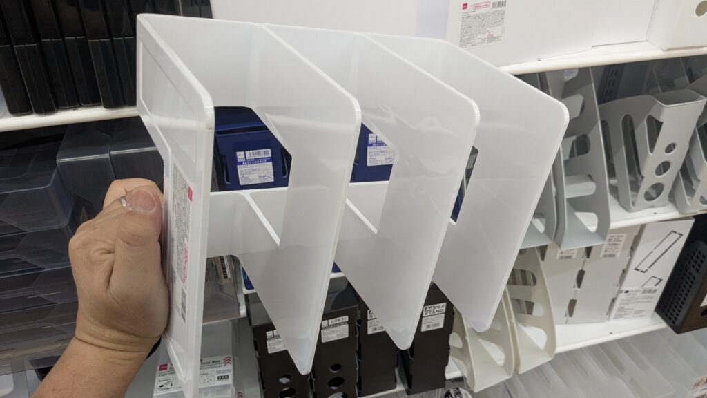 戸棚にピッタリサイズの 「ブックエンド(3つしきり、WH)」 が見事にミラクルフィット!