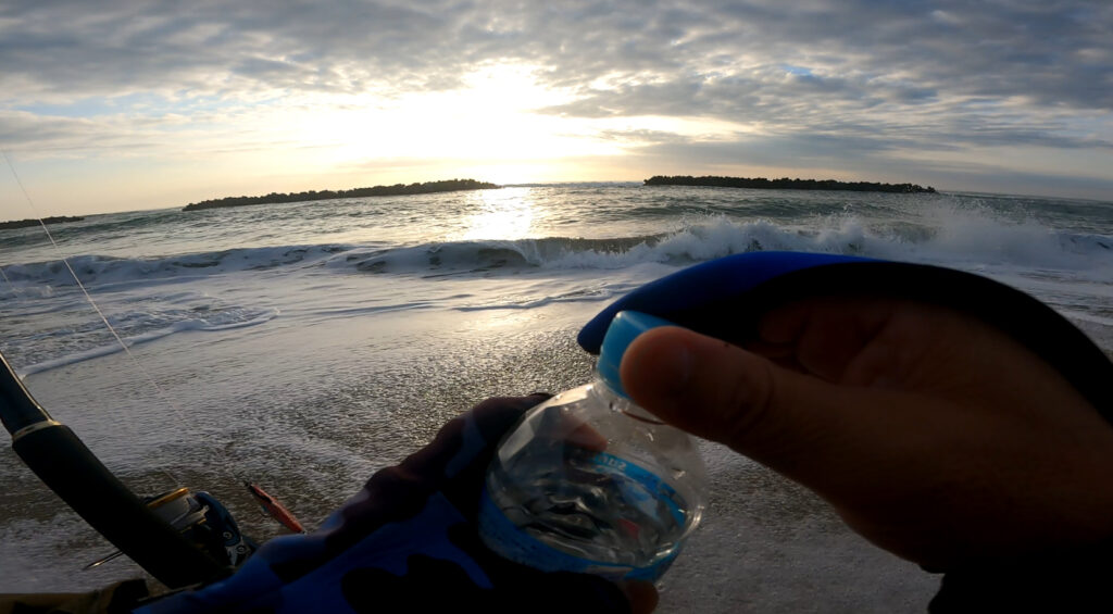リトリーブしても、フォールしても、波打ち際にも…まったく反応なし。