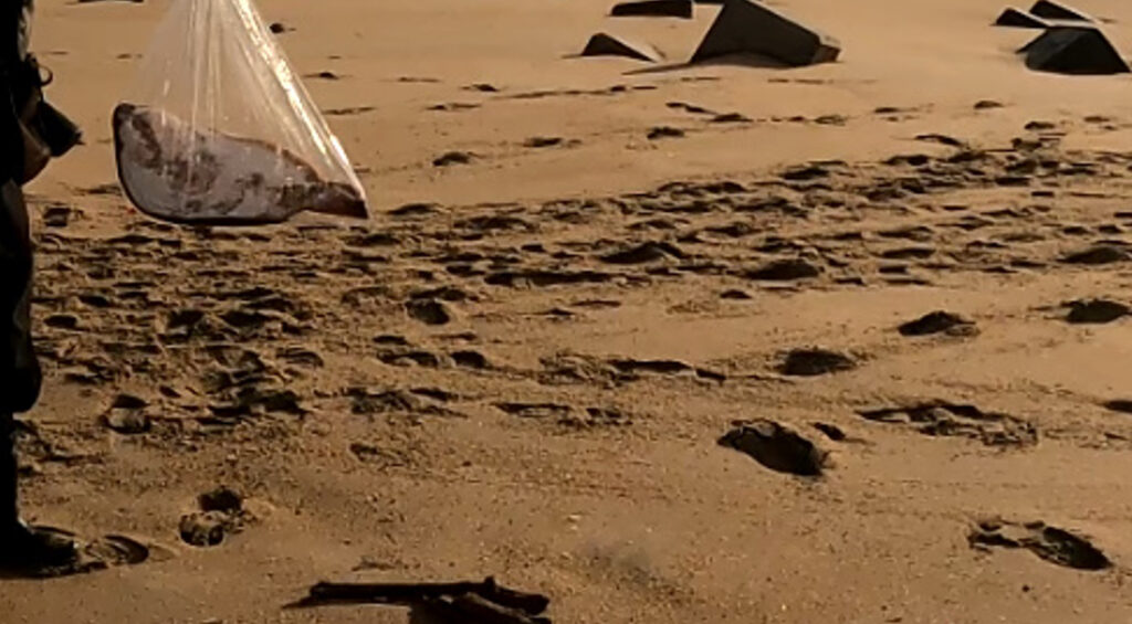 歩いてわずか1分、50mほど先でゴミ袋にドーンとヒラメを入れているアングラーを発見!
