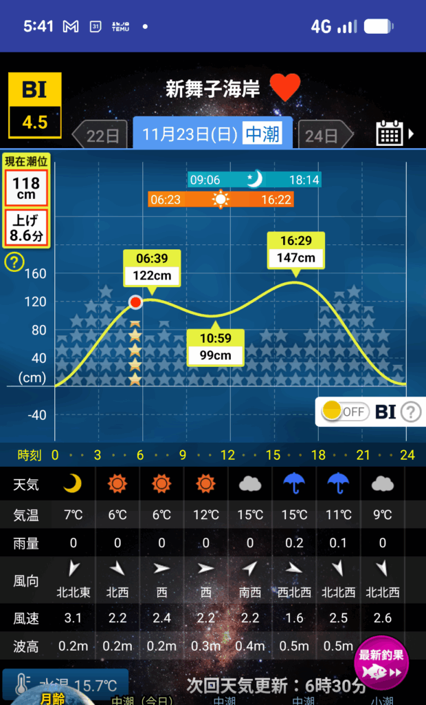 静かなベタ凪の海。中潮・上げ七分・水温15.7℃の好条件?!