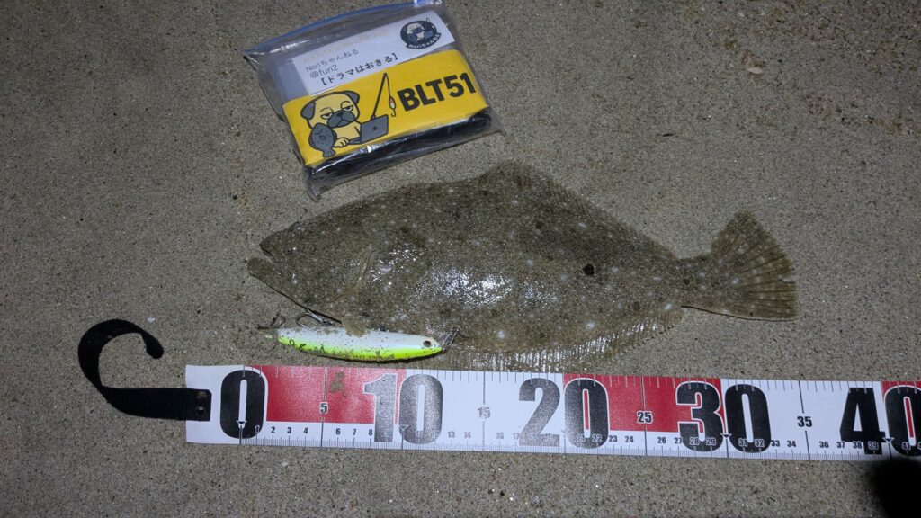 上がってきたのは 元気なソゲ(40cm未満のヒラメ)!