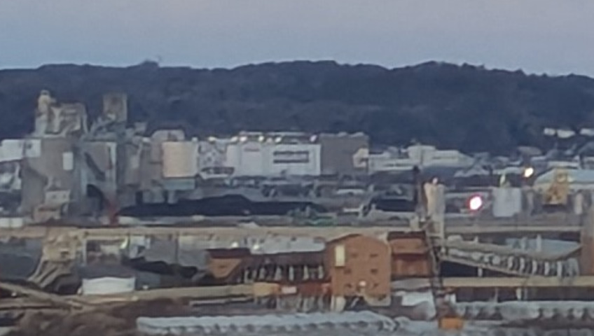 港湾施設、コンビナート。遠くにはイオンモール小名浜とマリンタワーが見える。