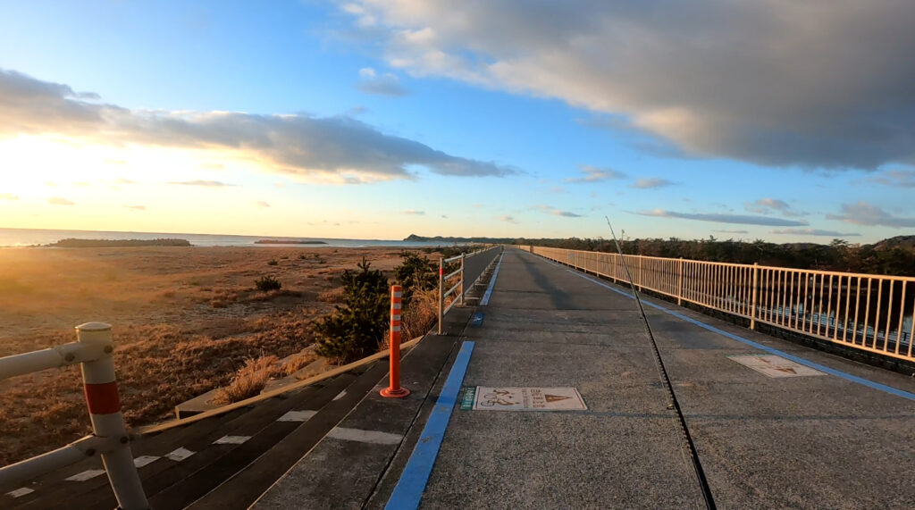 駐車場からポイントへ向かう頃には、すでに朝日が海面を照らしていた。